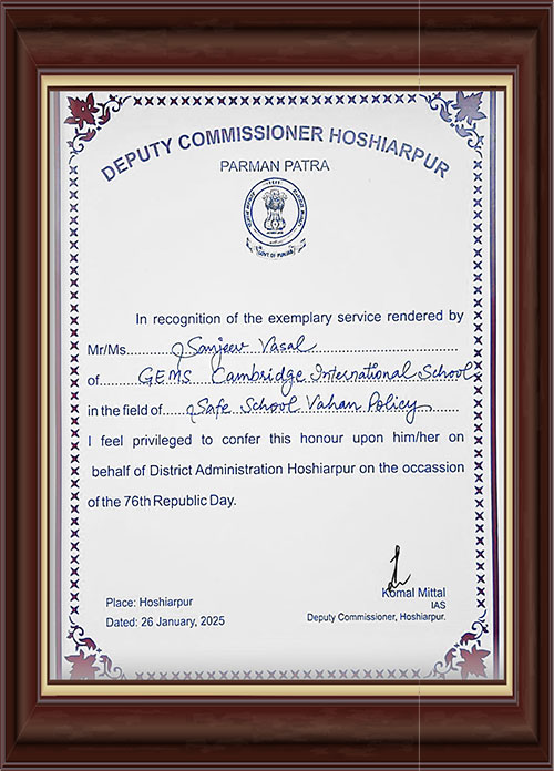 GEMS Cambridge International School, Hoshiarpur was recognised by the Education Minister during the Republic Day celebrations for maintaining the highest standards of student safety in transportation. The award acknowledged the school’s strict adherence to the Safe School Vahan Act and its commitment to ensuring secure and reliable school transport for every child.