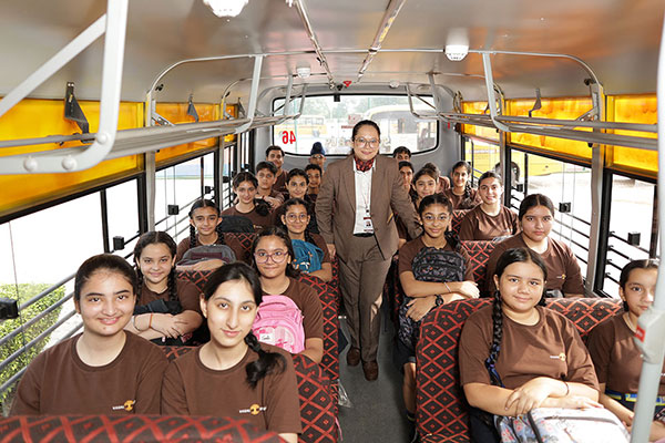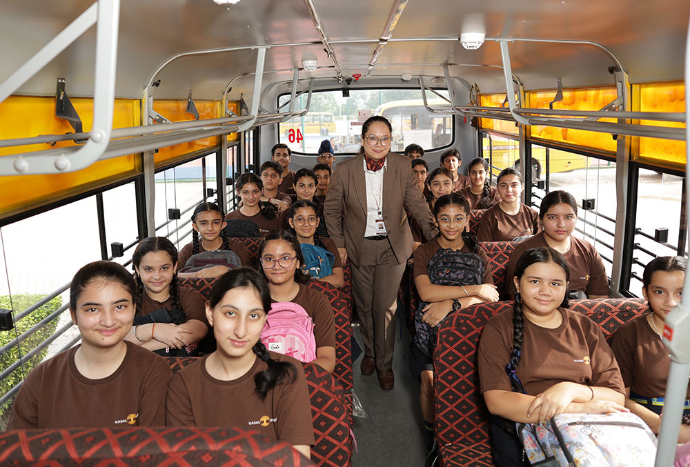 Our school takes the safety and comfort of our students seriously, which is why we have our fleet of 50 buses with a spacious parking area located right across from the school building. These buses meet all the guidelines set by the CBSE and the Honourable Supreme Court of India, including features like Vehicle Tracking Systems, Electronic Speed Governors, High Definition CCTV Cameras and Hydraulic Doors. In addition, each bus is staffed by a team of three individuals, including a driver, a male helper and a female attendant, who ensure the well-being and security of our students during their commute to and from school.
